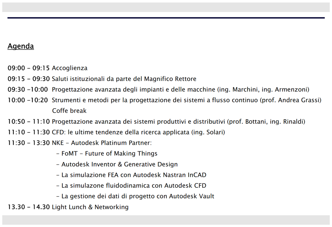 Mercoledì 15 giugno, a partire dalle ore 10:00, presso il Centro S. Elisabetta (Campus Universitario, Parma), FMB – Engine in collaborazione con l’Università degli Studi di Parma e con NKE (fornitrice e Platinum Partner di Autodesk) ha organizzato una conferenza tecnica dal titolo “La progettazione avanzata di macchine ed impianti industriali”. All’interno di questo appuntamento sono state esposte alla platea le possibilità innovative che strumenti avanzati possono fornire alla progettazione industriale. Il numeroso pubblico era composto, oltre che da rappresentanti accademici, anche e soprattutto dai delegati di molte aziende operanti nei più svariati ambiti, dall’alimentare, al chimico, al metalmeccanico-impiantistico. Un ringraziamento particolare va alla professoressa Sara Rainieri, delegata alla ricerca del Magnifico Rettore dell’Università di Parma, che ha aperto l’evento.